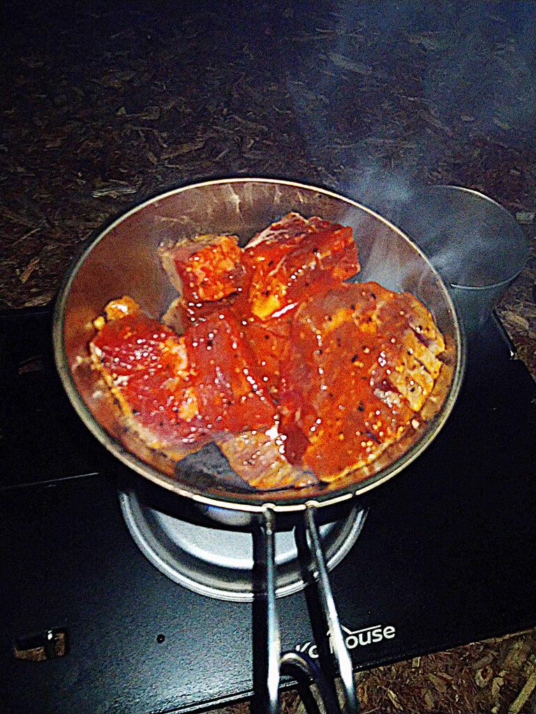 今日は、アルコールストーブ&シェラカップで料理することにしたのですが、焼いたり炒めたりするのは、難しいですね。