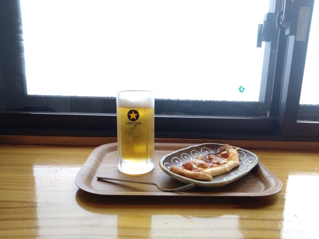 お風呂のあとのビールとピザです。窓の外が白く飛んでいますが、飛んでいなくても真っ白です。晴れていたらきっときれいな景色なんだろうと思いました。
