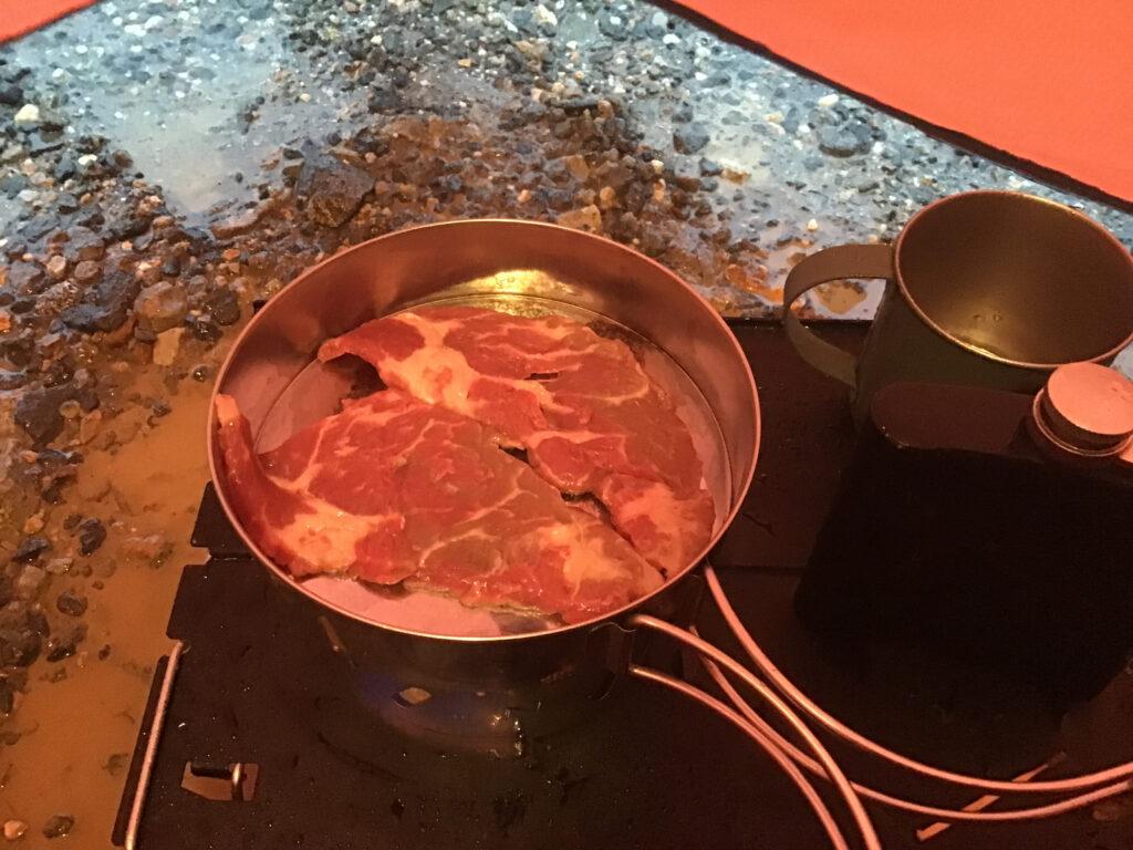今回は軽量化のためにアルコールストーブに、クッカーのみで料理です。ただ、肉とか焼くのに、クッカーの蓋のフライパンでは焼く料理は難しいとおもいまいした。