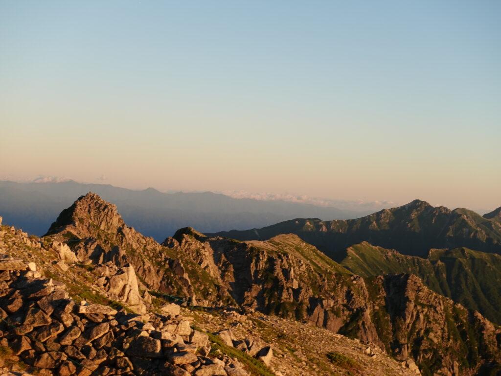 夕日に照らされた山々が美しいです。遠くに富士山も見えます。