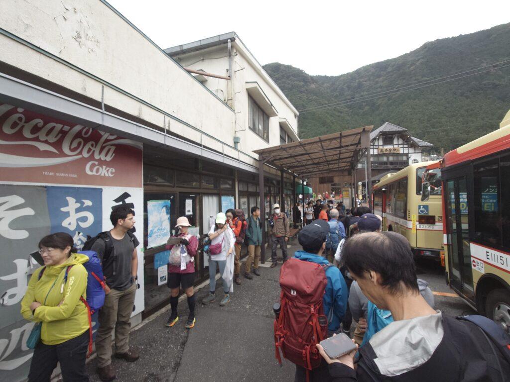 鴨沢のバス停まで途中で降りるは3人でした。鴨沢のバス停で降りて、1番にトイレに入りましたが、出てきても行列が出来ているわけではありませんでした。臨時便も到着したのですが、かもさわ登山口はごったがえするような感じにはなりませんでした。鴨沢のバス停近くの自動販売機でお茶を買って、靴紐をしっかり閉めて登山開始です。