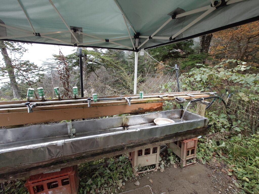 水を汲みに行くついでに、雲取山荘の施設を確認です。水場は、山でこんなに水を流していていいかぁというぐらいに潤沢に水が流れています。小屋泊の人用の自炊場もあります。